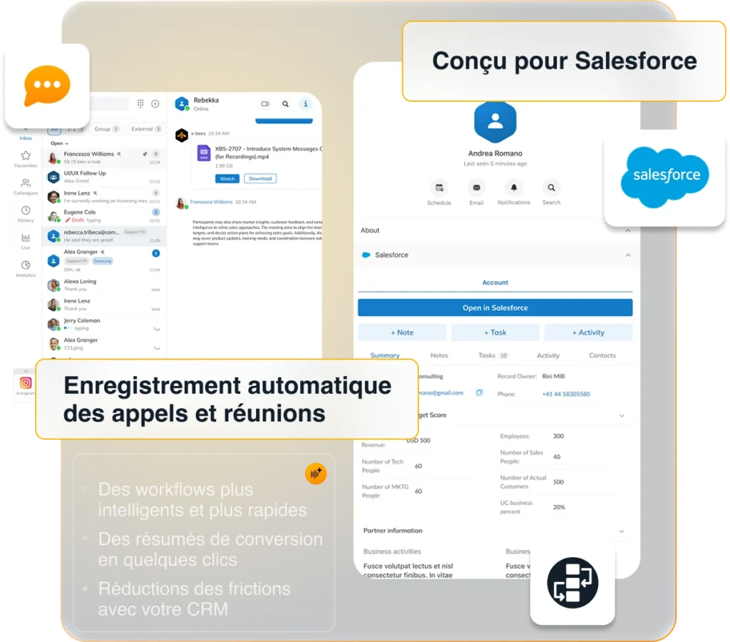Au‑delà de la simplification des communications (appels, chats, SMS et visioconférences), x‑bees AI va encore plus loin. En transformant chaque interaction client en données CRM exploitables au sein d’une plateforme unique, votre équipe peut se concentrer sur la qualité de ses conversations, sans se perdre dans la complexité de Salesforce.